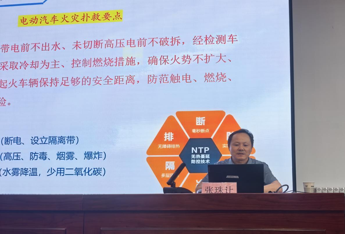 培训聚焦行业前沿,通过"理论+案例"多维授课模式,系统解析新能源汽车发展历程、核心构造原理及火灾特性。张老师结合多年实战经验,重点围绕火灾预防策略、应急处置技术、现场勘查要点等关键环节展开讲解,并针对充电桩自燃、电池热失控等典型场景进行案例推演。参训人员就灭火剂选用、破拆防护、事故溯源等实际问题与专家展开深入研讨,现场互动氛围热烈。