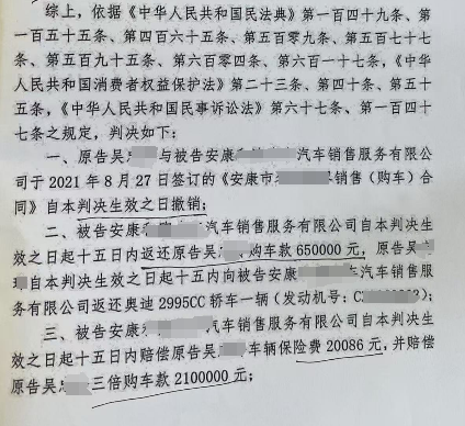 安康市汉滨区人民法院关于吴某诉安康某汽车销售服务有限公司销售欺诈一案,安康市中级人民法院摇号委托我公司进行鉴定,确定该车辆在销售前是否存在维修、是否存在以次充好消费欺诈行为。经我公司专家团队严格依法依规鉴定,确认该车辆在销售前存在维修、换件情形。最终法院采信我公司鉴定意见,判令安康某汽车销售服务有限公司退回吴某购车款65万元,并依照中华人民共和国消费者保护法判令安康某汽车销售服务有限公司赔偿吴某购3倍购车款210万元。